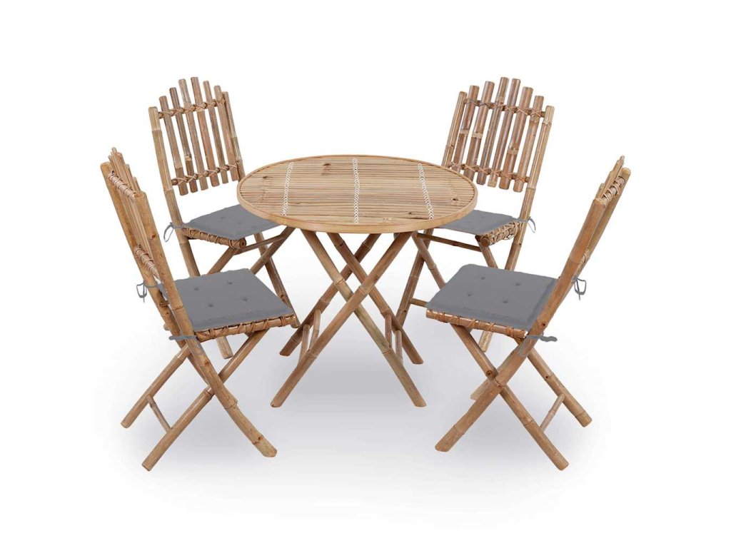 Zahradní jídelní set je zhotovený z masivního bambusu, je tedy pevný a hodně toho vydrží. Skvěle také odolává vodě a dalším klimatickým vlivům a k očištění vám postačí navlhčený hadřík. Stůl i židle lze složit, abyste ušetřili místo, když je zrovna nepoužíváte. Přiložené podušky se vám při odpočinku postarají o maximální pohodlí. Jsou ušité ze 100% polyesteru s voděodolnou úpravou a každá z nich je opatřená dvěma páry šňůrek, kterými je můžete k židli pevně přichytit.