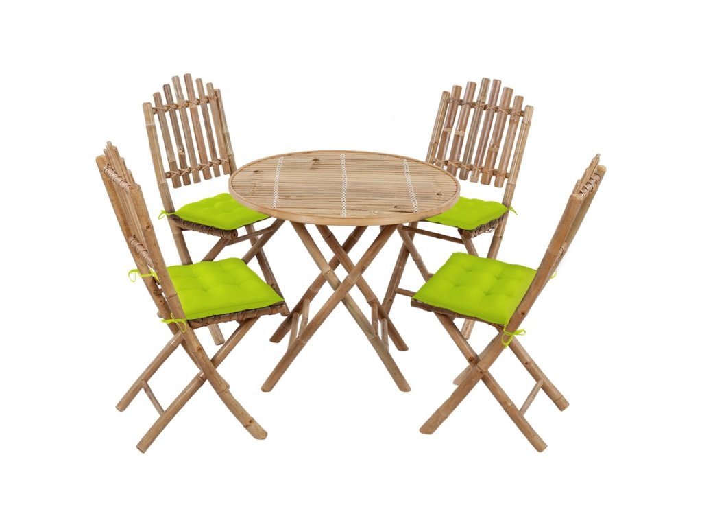 Zahradní jídelní set je zhotovený z masivního bambusu, je tedy pevný a hodně toho vydrží. Skvěle také odolává vodě a dalším klimatickým vlivům a k očištění vám postačí navlhčený hadřík. Stůl i židle lze složit, abyste ušetřili místo, když je zrovna nepoužíváte. Přiložené podušky se vám při odpočinku postarají o maximální pohodlí. Jsou ušité ze 100% polyesteru s voděodolnou úpravou a každá z nich je opatřená dvěma páry šňůrek, kterými je můžete k židli pevně přichytit.