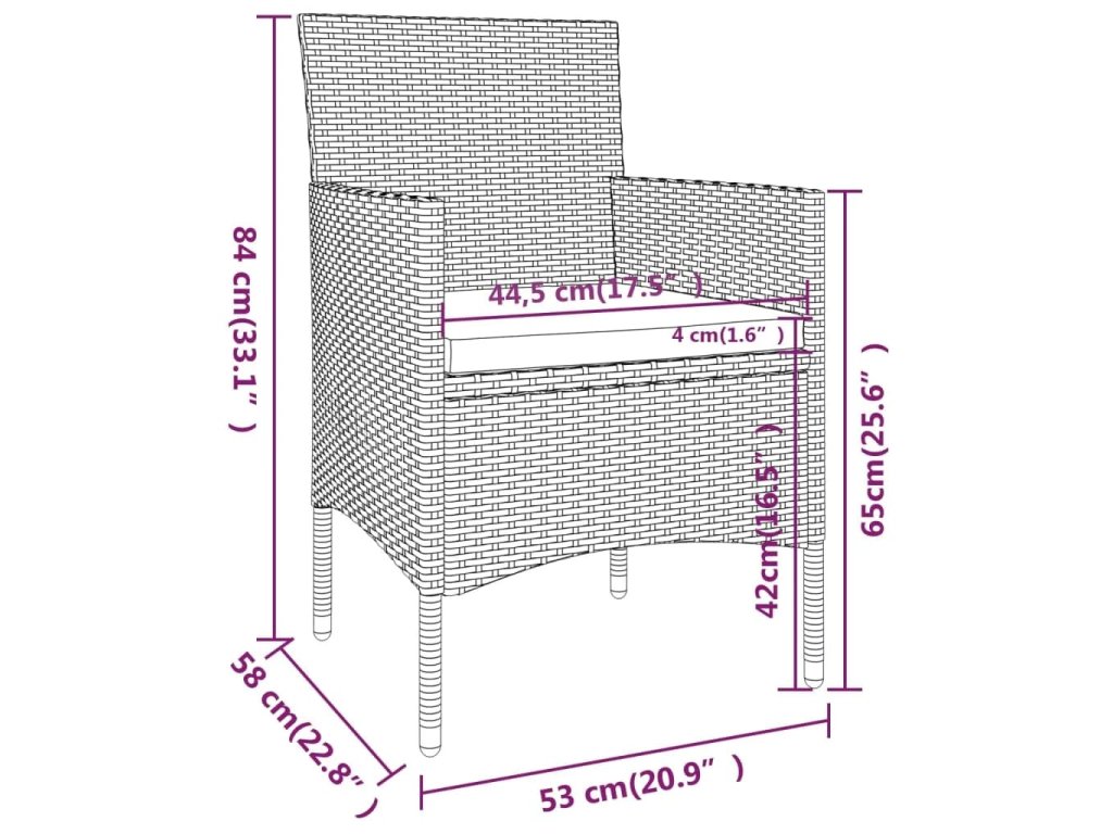 - Prvotřídní materiál: Stůl a židle mají práškově lakovaný ocelový rám opletený PE ratanem, který skvěle odolává povětrnostním vlivům, takže jsou odolné a stabilní.