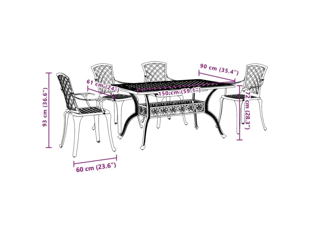 - Robustní a odolný rám: Tento zahradní jídelní set je zhotovený z litého hliníku, je tedy dostatečně robustní a odolný, aby vám zaručil dlouhá léta používání. Materiál je odolný vůči korozi a povětrnostním vlivům, takže jej můžete venku používat po celý rok.