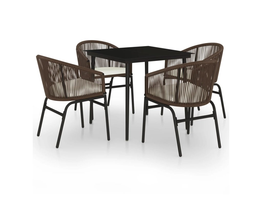 Zahradní jídelní set má práškově lakovaný ocelový rám, takže je robustní a stabilní a ideální pro venkovní použití. Hladká skleněná deska stolu se snadno čistí vlhkým hadříkem a skvěle vám poslouží k podávání jídla a pití nebo k vystavení různých dekorativních předmětů. Židle jsou vyrobené z PVC ratanu, jsou proto odolné a výborně vzdorují UV záření i špatnému počasí. Každá z nich je navíc opatřená odnímatelnou hustě polstrovanou poduškou, a zpříjemní vám tak váš odpočinek.