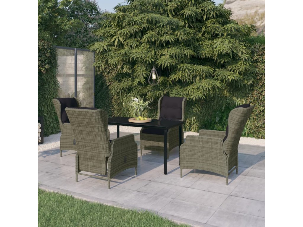 Praktický zahradní jídelní set má ocelový rám, takže je pevný a má dlouhou životnost. Polohovací židle jsou vyrobené z voděodolného PE ratanu, který nevyžaduje žádnou údržbu, hodí se proto skvěle k venkovnímu použití. Hustě polstrované podušky vám při stolování poskytnou maximální pohodlí. Potah podušky je opatřený zipem, lze ho tedy stáhnout a vyprat. Pomocí mechanismu s plynovým pístem si navíc snadno přizpůsobíte opěradlo křesla podle vlastních potřeb. Stisknutím tlačítka na boku ho sklopíte do té nejpohodlnější pozice. Hladká skleněná stolní deska, kterou jednoduše očistíte vlhkým hadříkem, je ideální k podávání jídla a pití nebo k vystavování různých dekorativních předmětů.