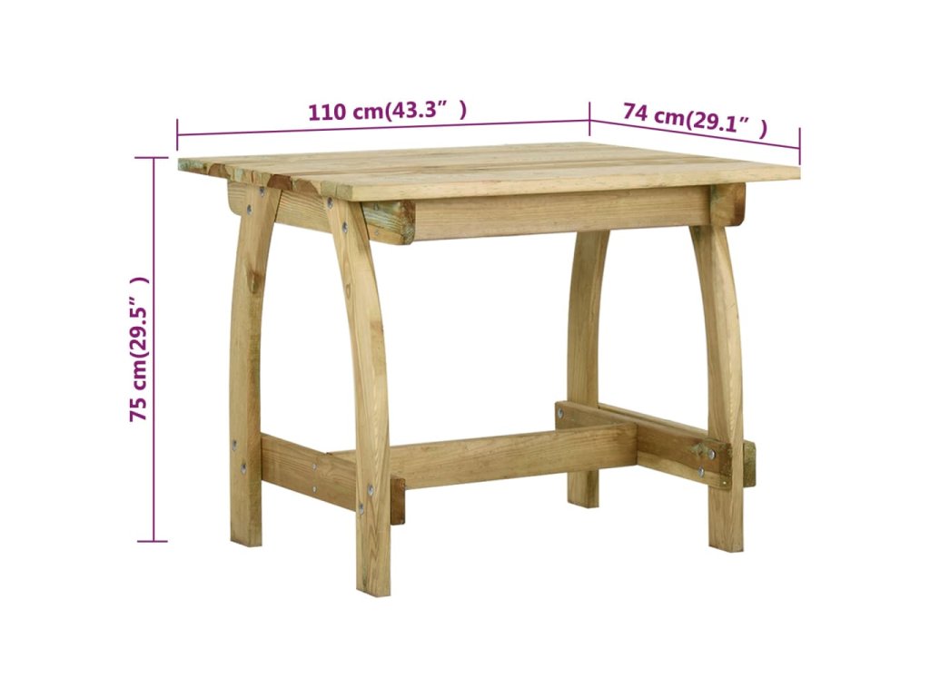Tento jídelní set ze zeleně impregnovaného borového dřeva je velmi pevný, dlouho vydrží a je odolný vůči korozi. Je ideální volbou pro příjemně strávené chvíle u večeře s rodinou nebo přáteli v romantické zahradě na venkově nebo u idylického zahradního jezírka. Vezměte prosím na vědomí, že dřevo je přírodní produkt a může vykazovat nedokonalosti.