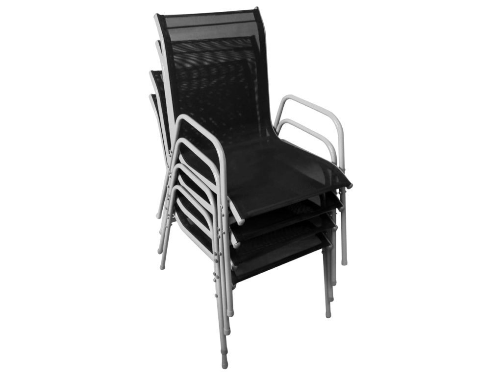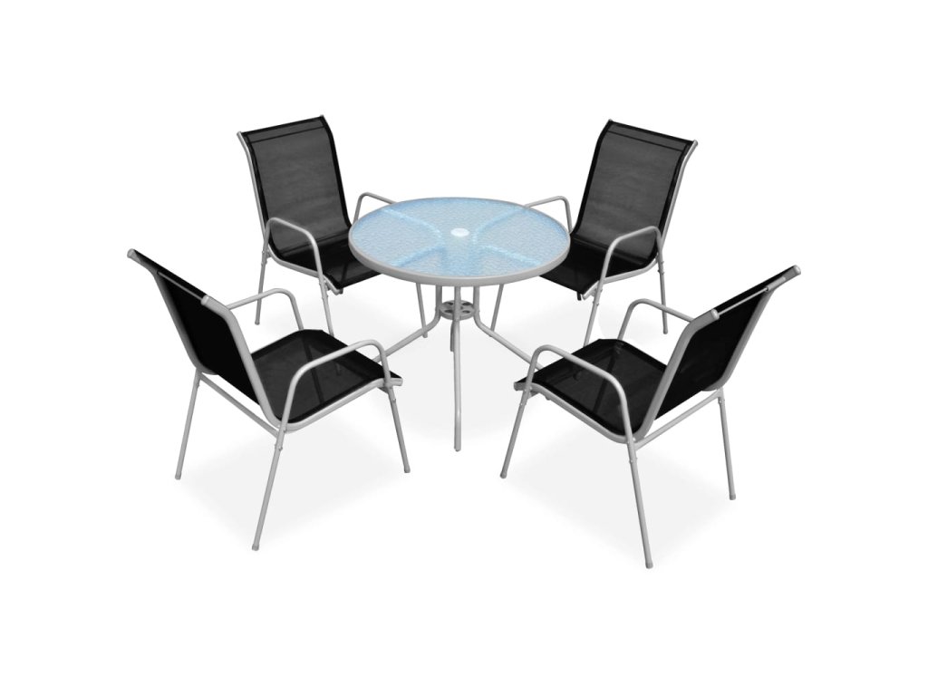 Komfortní židle jsou vyrobeny z kvalitní oceli s práškovým nástřikem. Díky silné textilní látce jsou naše židle odolné vůči počasí a snadno udržovatelné. Židle jsou stohovatelné, aby jste ušetřily místo. Stůl má desku o tloušťce 5 mm, vyrobenou z tvrzeného zvlněného skla, na kterou můžete umístit nápoje, občerstvení nebo dekorativní předměty. Má také robustní ocelový rám s práškovým nástřikem, který je odolný a snadno se udržuje. S otvorem na slunečník uprostřed stolu, jak na vrchu stolu, tak i pod ním, můžete tedy snadno umístit velký baldachýn pro vytvoření stínu během horkého léta. Jeho montáž je také velmi snadná.