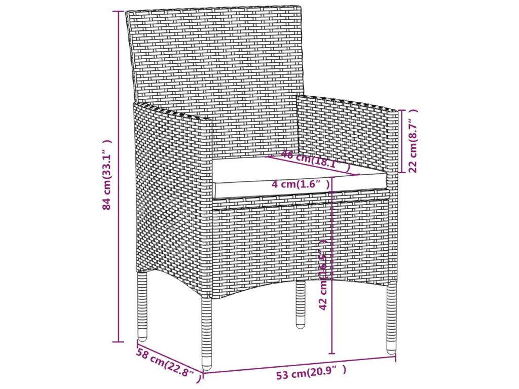 Stůl a židle mají práškově lakovaný ocelový rám opletený PE ratanem, který skvěle odolává povětrnostním vlivům i UV záření, jsou tedy stabilní a mají dlouhou životnost. Židle jsou navrženy se zaobleným opěradlem a područkami pro maximální pohodlí. Součástí balení jsou také podušky, které vám poskytnou ještě větší komfort. Potah je navíc vybaven zipem, takže se dá jednoduše sejmout a vyprat. Stolní deska je zhotovená ze zesíleného tvrzeného skla zasazeného v pevném rámu, snadno se tedy čistí a udržuje. Dvě podnožky zároveň slouží jako dodatečná místa k sezení. Nábytek se vyznačuje lehkou konstrukcí, všechny kusy lze tudíž bez námahy přemisťovat, přestavovat a přepravovat.