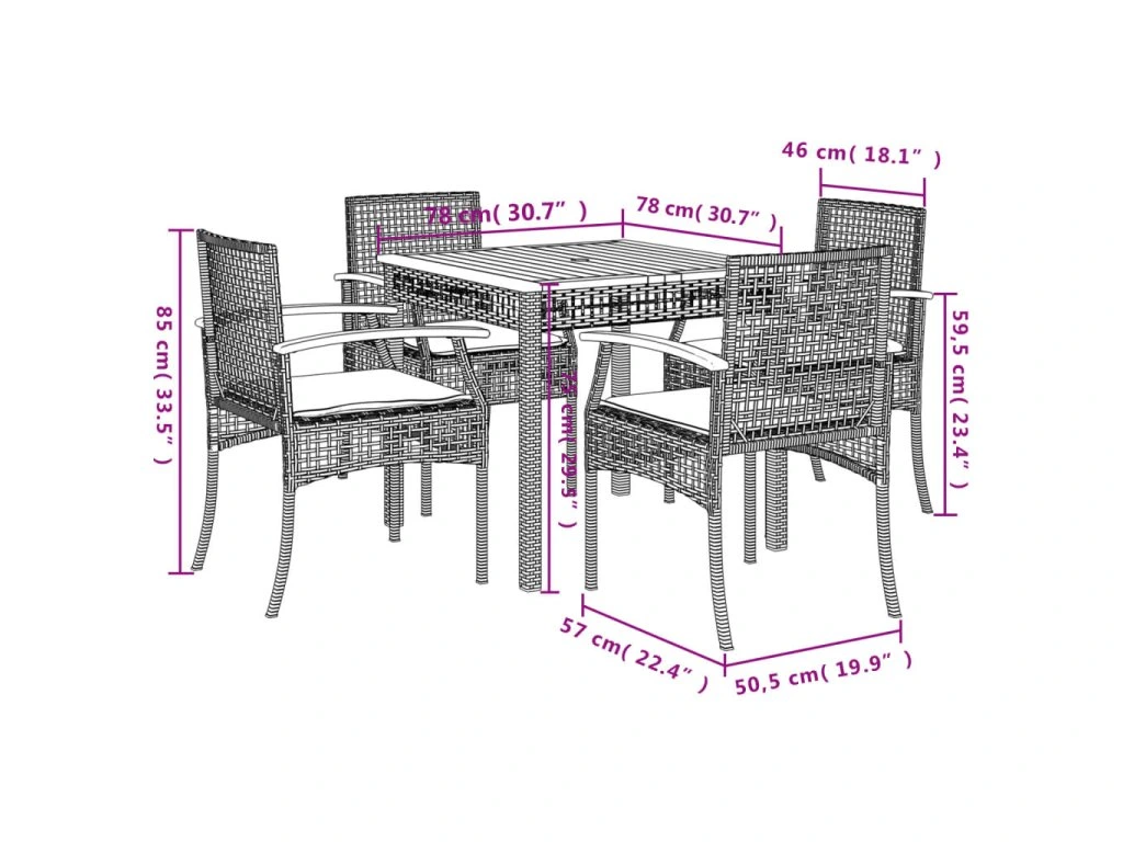 - Materiál: PE ratan, práškově lakovaná ocel, masivní akáciové dřevo s olejovou povrchovou úpravou