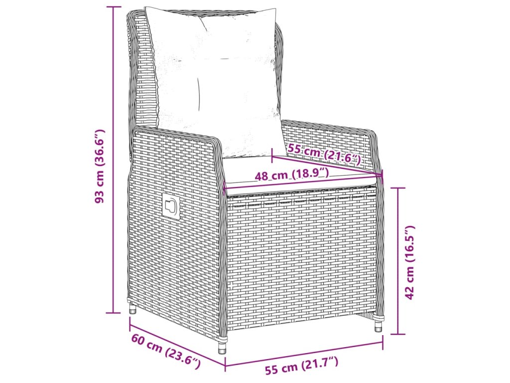 - Rozměry při poloze vsedě: 55 x 60 x 93 cm (Š x H x V)