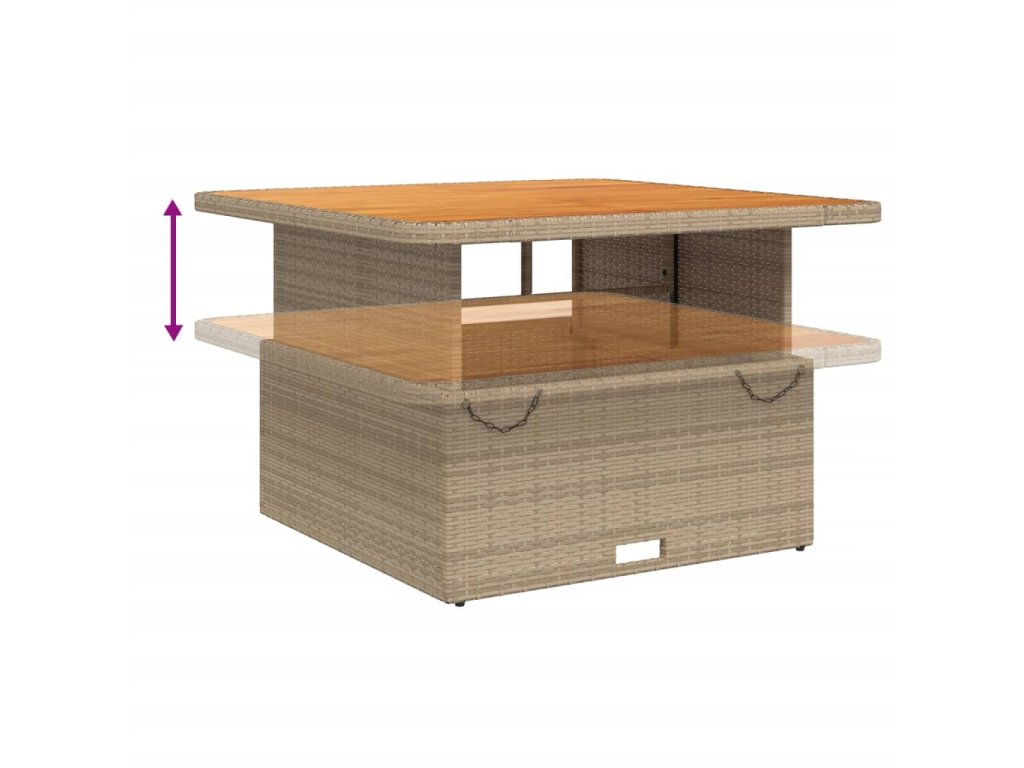 - Nastavitelná deska stolu: Stolní desku lze zvednout tak, aby stůl byl vyšší, takže jej můžete přeměnit z konferenčního stolku na jídelní. Skvěle se hodí pro návštěvy nebo pro stolování venku.