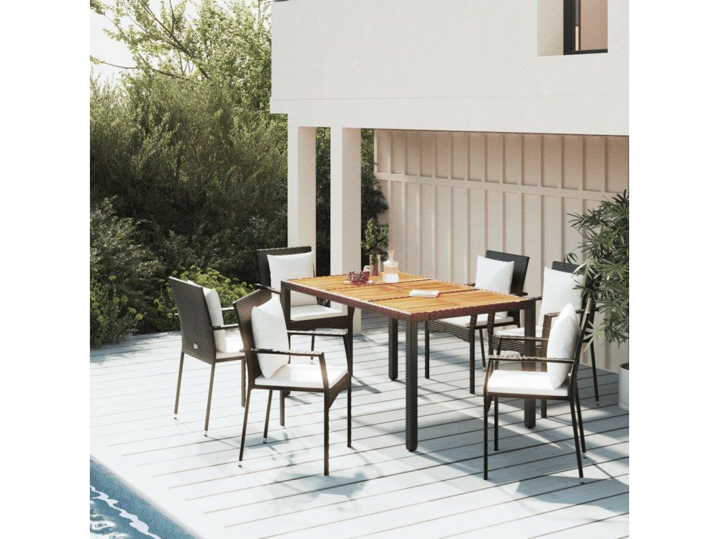 - Materiál: PE ratan, práškově lakovaná ocel, masivní akáciové dřevo s olejovou povrchovou úpravou