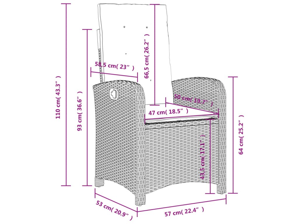 - Rozměry při poloze vsedě: 57 x 58,5 x 93 cm (Š x H x V)