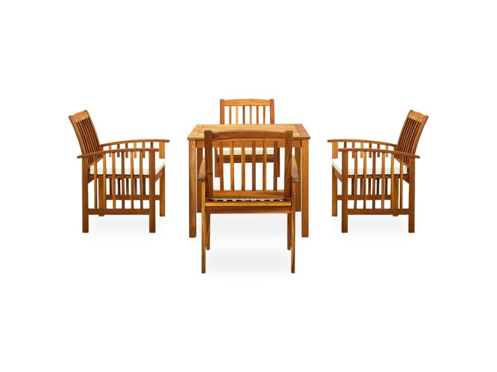 Jídelní stůl je vyrobený z masivního akáciového dřeva, tvrdého dřeva s hustou strukturou, takže je robustní, odolný a snadno se udržuje. Na dřevěnou stolní desku můžete prostřít k jídlu, servírovat nápoje a odkládat si celou řadu věcí. Dřevěné rámy židlí jsou ošetřené olejem a na vaši terasu nebo dvorek vnesou klasický vzhled a vaše venkovní bydlení oživí svým přírodním šarmem. Hustě polstrované podušky vám poskytnou dodatečné pohodlí při sezení a relaxaci. Tuto sestavu zahradního nábytku můžete snadno očistit vlhkým hadříkem.