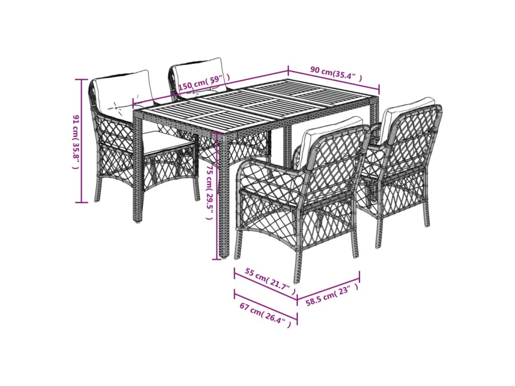 - Materiál: PE ratan, práškově lakovaná ocel, masivní akáciové dřevo s olejovou povrchovou úpravou