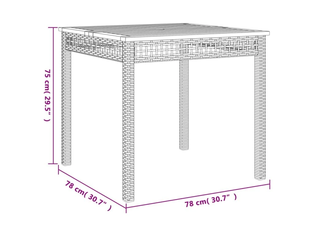 - Materiál: PE ratan, práškově lakovaná ocel, masivní akáciové dřevo s olejovou povrchovou úpravou