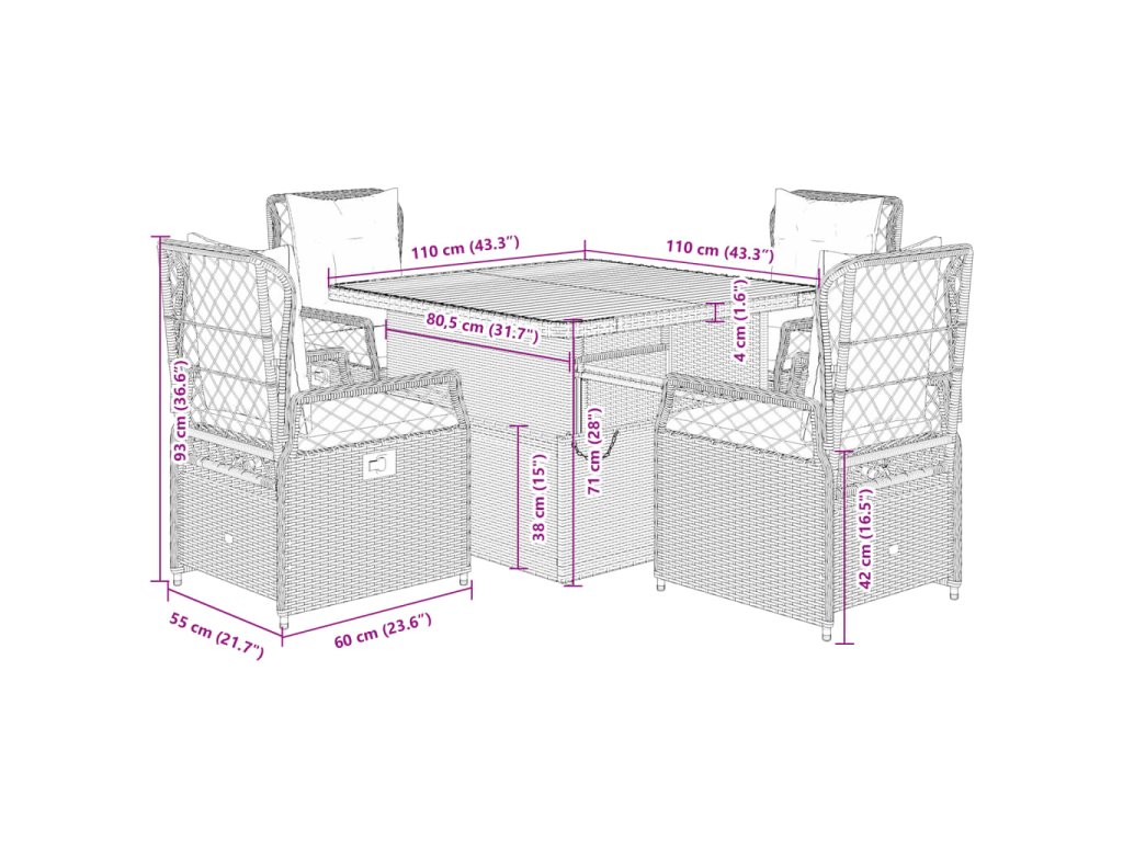 - Rozměry: 110 x 110 x 40/71 cm (D x Š x V)