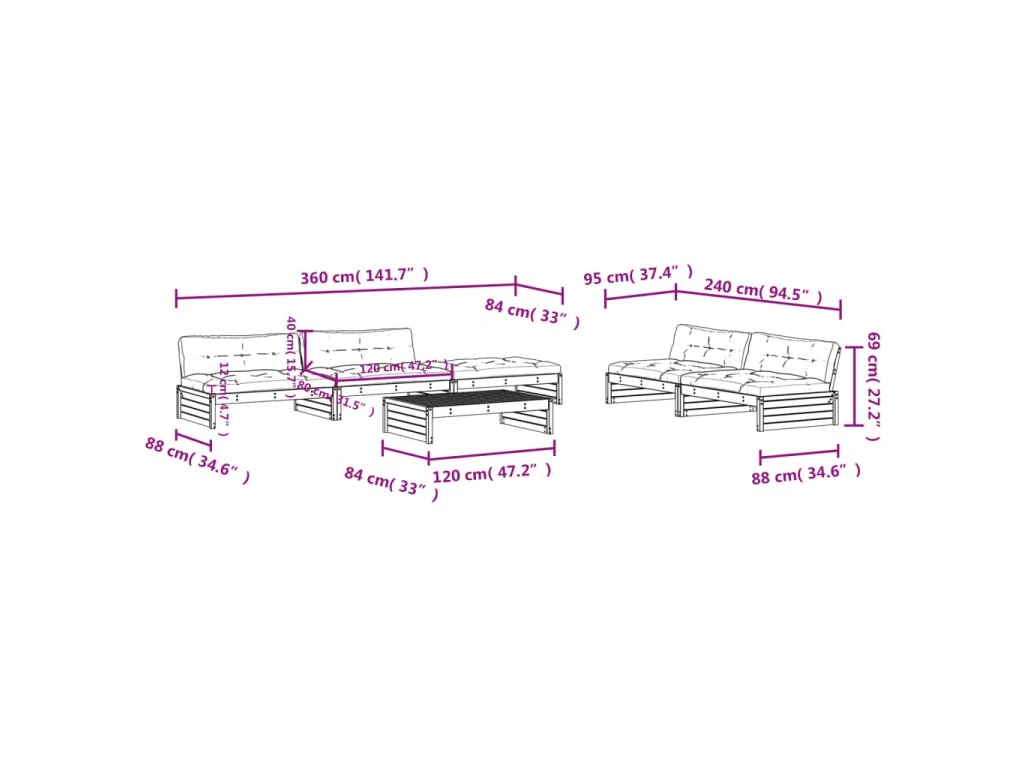 - Rozměry středové pohovky: 120 x 95 x 69 cm (D x Š x V)