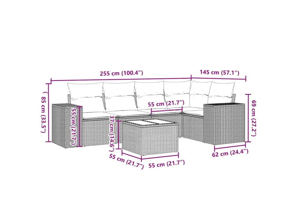 Tato zahradní sedací souprava je dokonalým doplňkem vaší zahrady, terasy nebo dvorku a poskytne vám pohodlné a příjemné místo, kde si můžete povídat s rodinou a přáteli nebo jen tak odpočívat a užívat si pobyt venku.