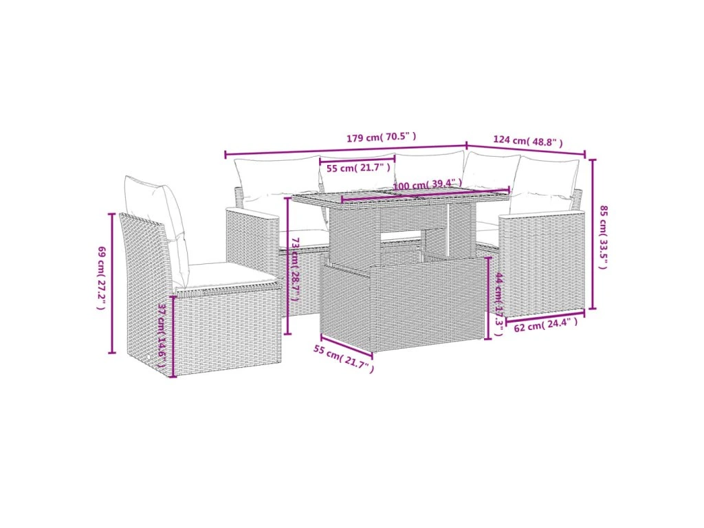 Tato zahradní sedací souprava je dokonalým doplňkem vaší zahrady, terasy nebo dvorku a poskytne vám pohodlné a příjemné místo, kde si můžete povídat s rodinou a přáteli nebo jen tak odpočívat a užívat si pobyt venku.