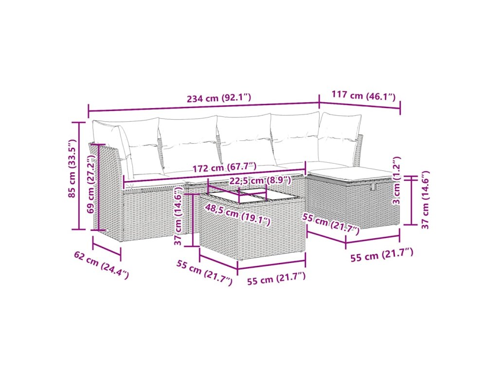 Tato zahradní sedací souprava je dokonalým doplňkem vaší zahrady, terasy nebo dvorku a poskytne vám pohodlné a příjemné místo, kde si můžete povídat s rodinou a přáteli nebo jen tak odpočívat a užívat si pobyt venku.