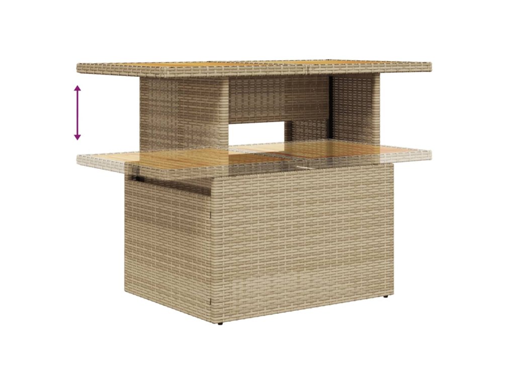 - Nastavitelná deska stolu: Stolní desku lze zvednout tak, aby stůl byl vyšší, takže jej můžete přeměnit z konferenčního stolku na jídelní. Skvěle se hodí pro návštěvy nebo pro stolování venku.