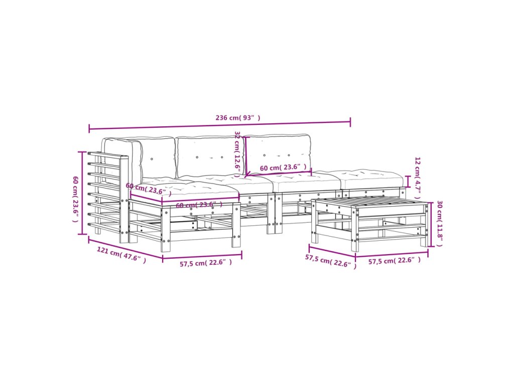 - Rozměry středové pohovky: 57,5 x 63,5 x 60 cm (D x Š x V)