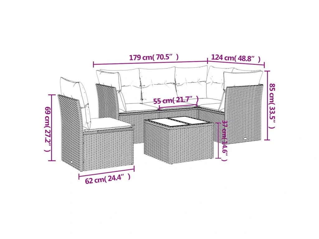 Tato zahradní sedací souprava je dokonalým doplňkem vaší zahrady, terasy nebo dvorku a poskytne vám pohodlné a příjemné místo, kde si můžete povídat s rodinou a přáteli nebo jen tak odpočívat a užívat si pobyt venku.