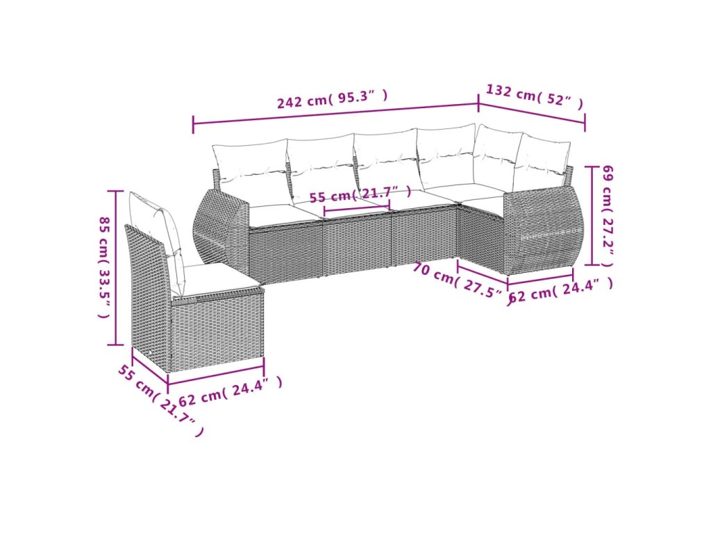 Tato zahradní sedací souprava je dokonalým doplňkem vaší zahrady, terasy nebo dvorku a poskytne vám pohodlné a příjemné místo, kde si můžete povídat s rodinou a přáteli nebo jen tak odpočívat a užívat si pobyt venku.