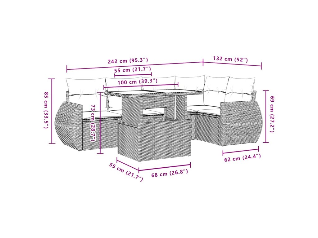 Tato zahradní sedací souprava je dokonalým doplňkem vaší zahrady, terasy nebo dvorku a poskytne vám pohodlné a příjemné místo, kde si můžete povídat s rodinou a přáteli nebo jen tak odpočívat a užívat si pobyt venku.
