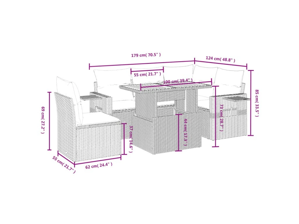 Tato zahradní sedací souprava je dokonalým doplňkem vaší zahrady, terasy nebo dvorku a poskytne vám pohodlné a příjemné místo, kde si můžete povídat s rodinou a přáteli nebo jen tak odpočívat a užívat si pobyt venku.