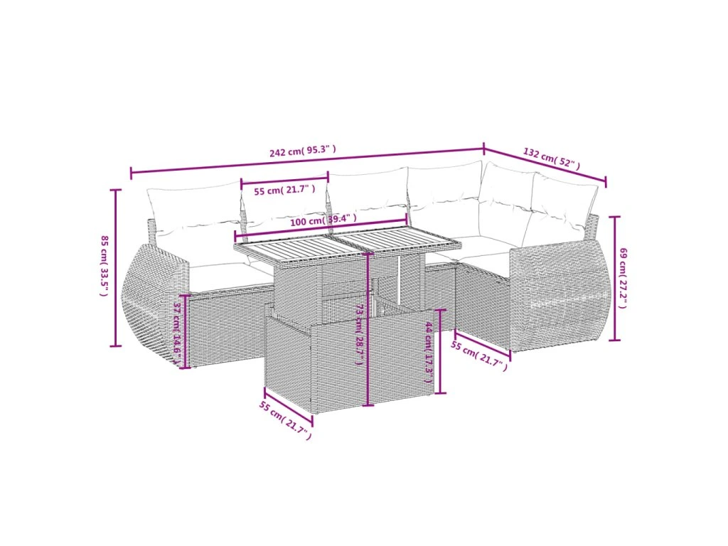 Tato zahradní sedací souprava je dokonalým doplňkem vaší zahrady, terasy nebo dvorku a poskytne vám pohodlné a příjemné místo, kde si můžete povídat s rodinou a přáteli nebo jen tak odpočívat a užívat si pobyt venku.