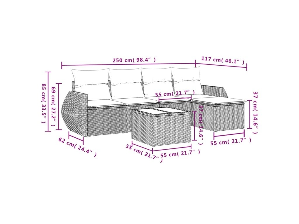 Tato zahradní sedací souprava je dokonalým doplňkem vaší zahrady, terasy nebo dvorku a poskytne vám pohodlné a příjemné místo, kde si můžete povídat s rodinou a přáteli nebo jen tak odpočívat a užívat si pobyt venku.