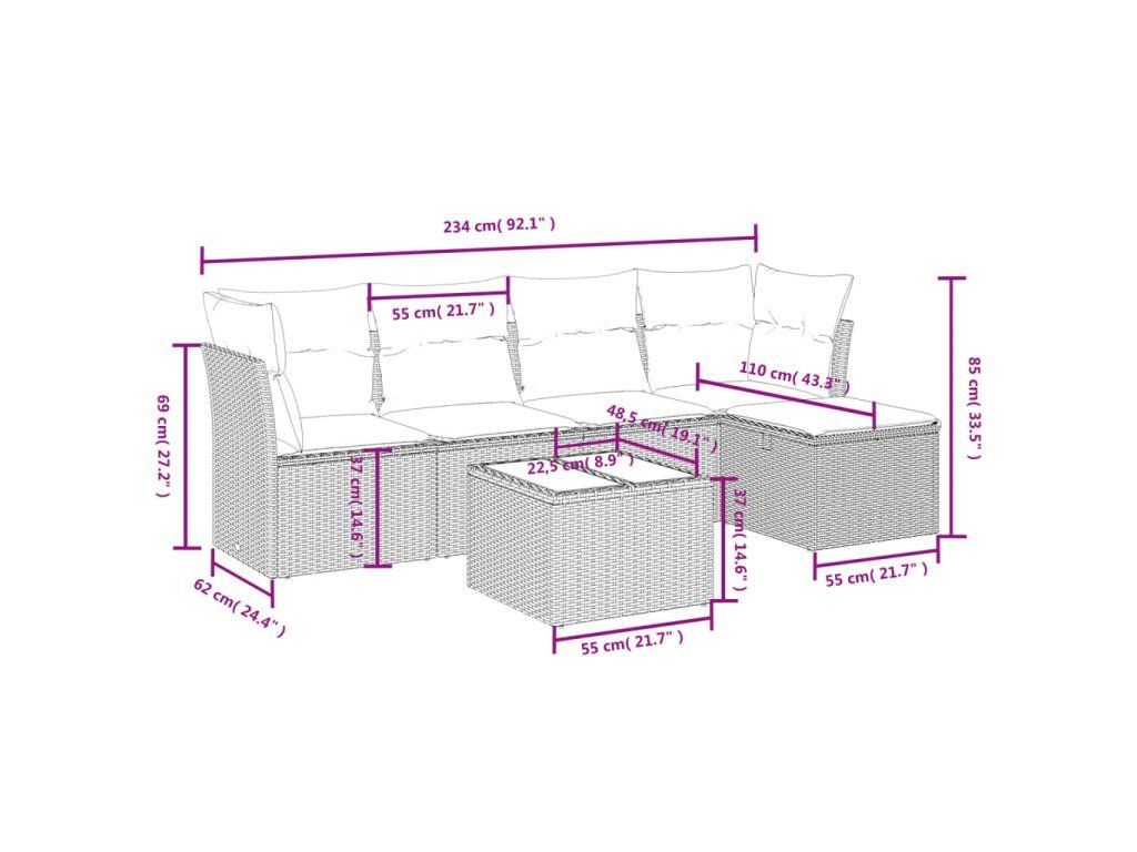 Tato zahradní sedací souprava je dokonalým doplňkem vaší zahrady, terasy nebo dvorku a poskytne vám pohodlné a příjemné místo, kde si můžete povídat s rodinou a přáteli nebo jen tak odpočívat a užívat si pobyt venku.