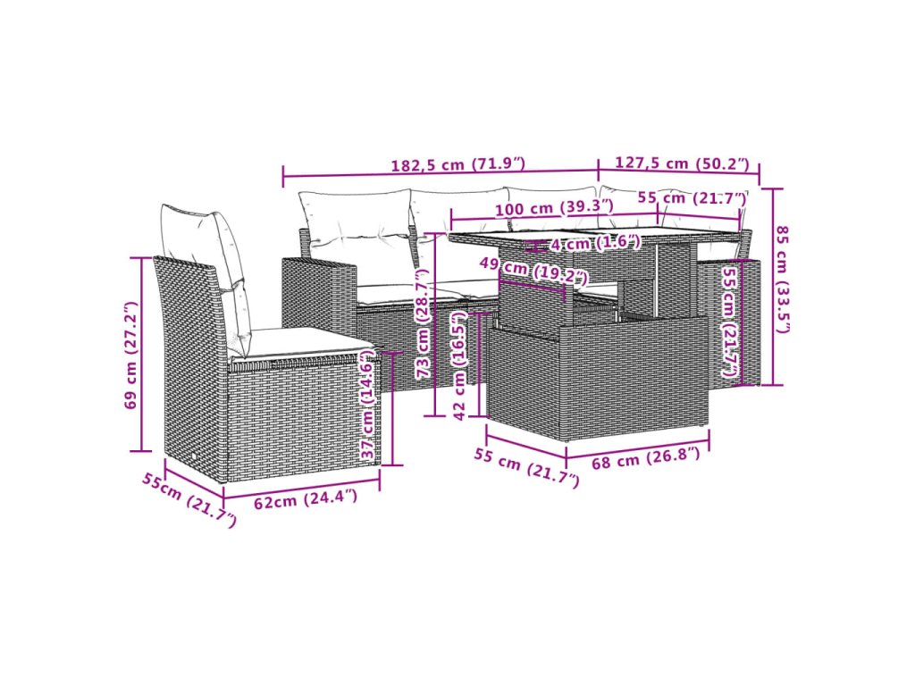 Tato zahradní sedací souprava je dokonalým doplňkem vaší zahrady, terasy nebo dvorku a poskytne vám pohodlné a příjemné místo, kde si můžete povídat s rodinou a přáteli nebo jen tak odpočívat a užívat si pobyt venku.
