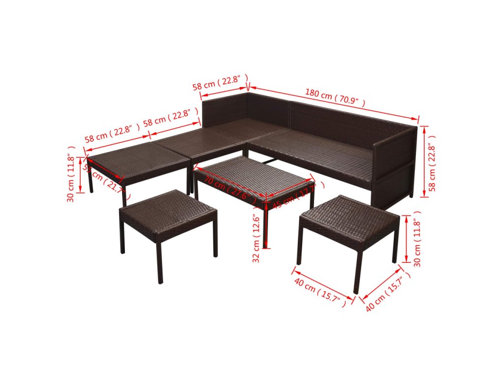 Balení obsahuje 1 pohovku, 1 konferenční stolek, 2 velké taburety, 2 malé taburety, 3 polstry na opěradla a 6 polstrů na sedáky. Poznámka: Doporučujeme vám soupravu za deště, sněhu a mrazu přikrýt.