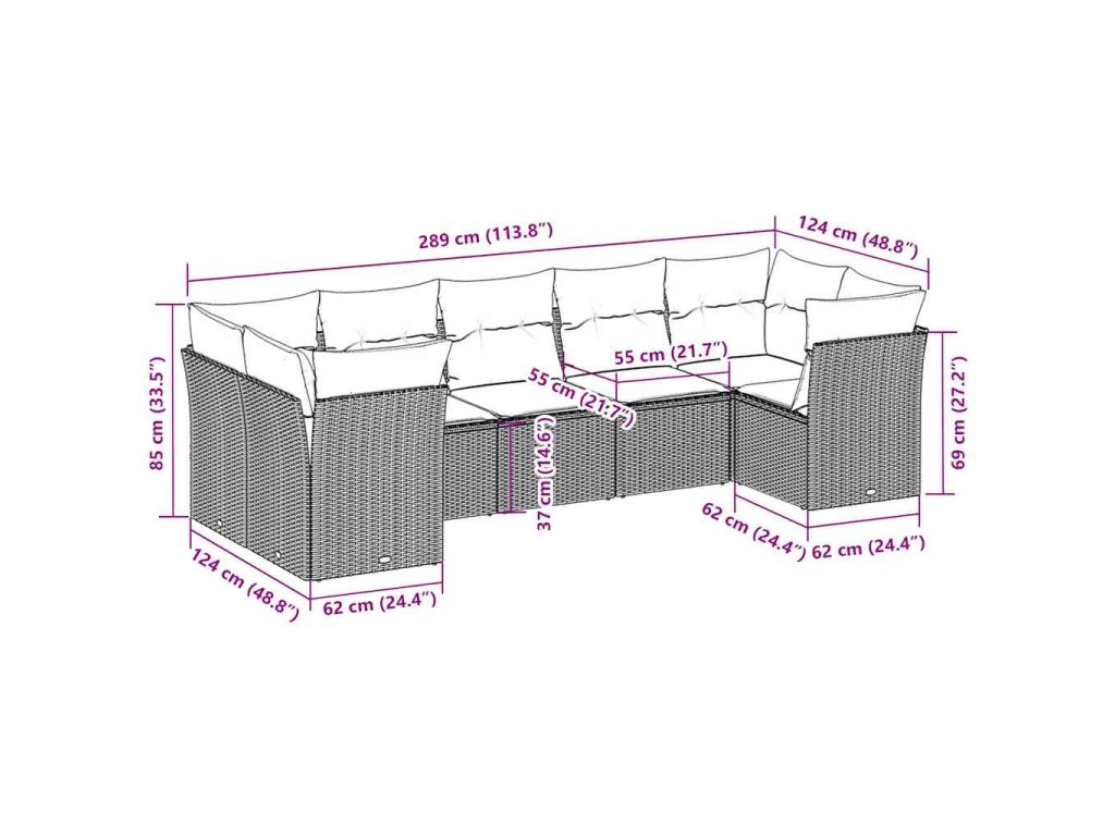 - Celkové rozměry pohovky: 289 x 124 x 69 cm (Š x H x V)