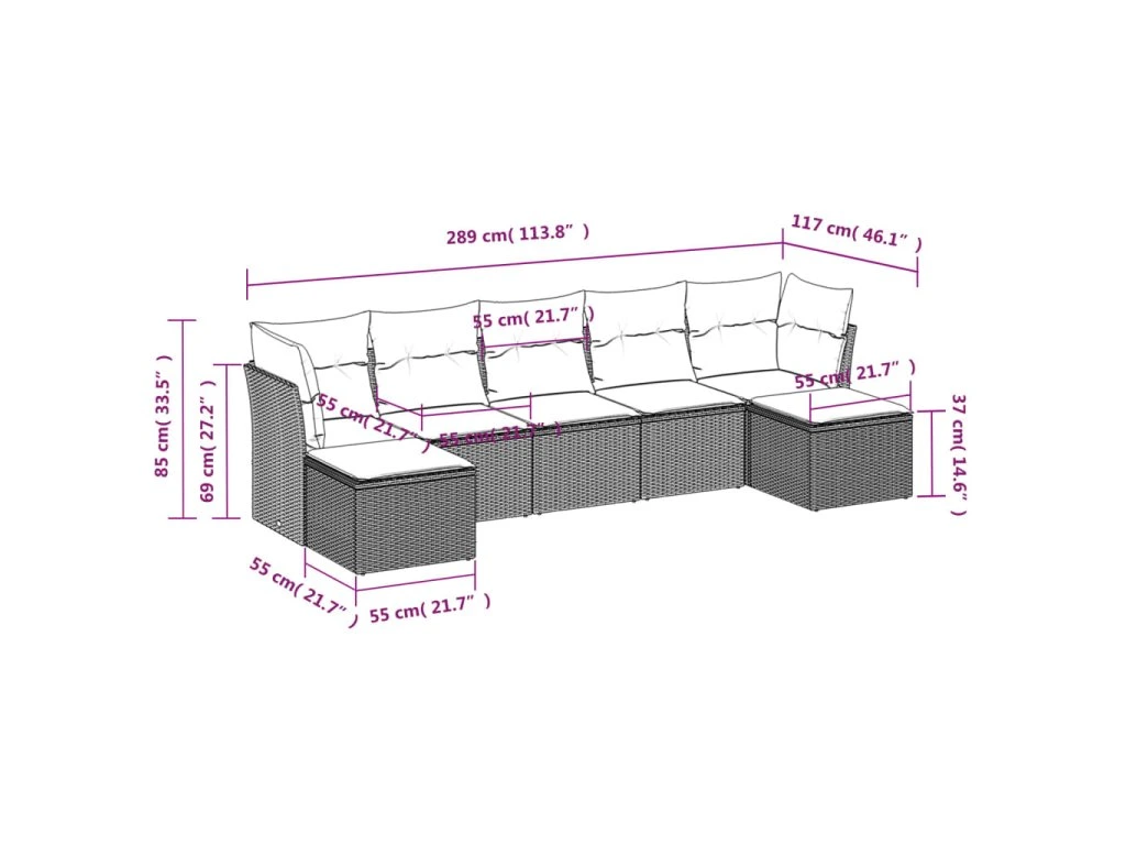 - Celkové rozměry pohovky: 289 x 117 x 69 cm (Š x H x V)