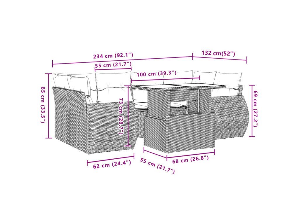 Tato zahradní sedací souprava je dokonalým doplňkem vaší zahrady, terasy nebo dvorku a poskytne vám pohodlné a příjemné místo, kde si můžete povídat s rodinou a přáteli nebo jen tak odpočívat a užívat si pobyt venku.