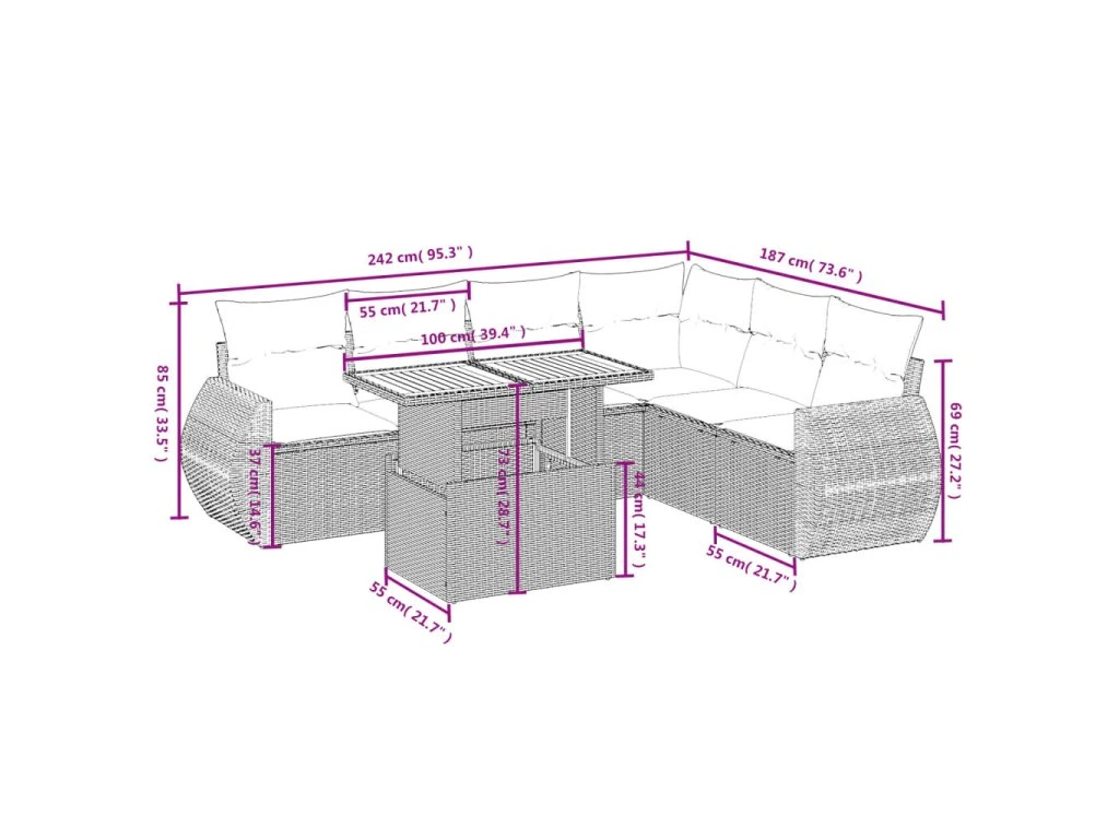 Tato zahradní sedací souprava je dokonalým doplňkem vaší zahrady, terasy nebo dvorku a poskytne vám pohodlné a příjemné místo, kde si můžete povídat s rodinou a přáteli nebo jen tak odpočívat a užívat si pobyt venku.
