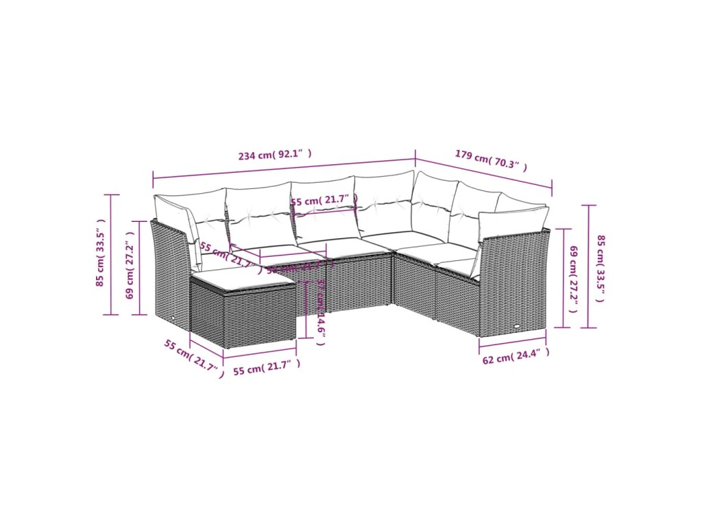 - Celkové rozměry pohovky: 234 x 179 x 69 cm (Š x H x V)