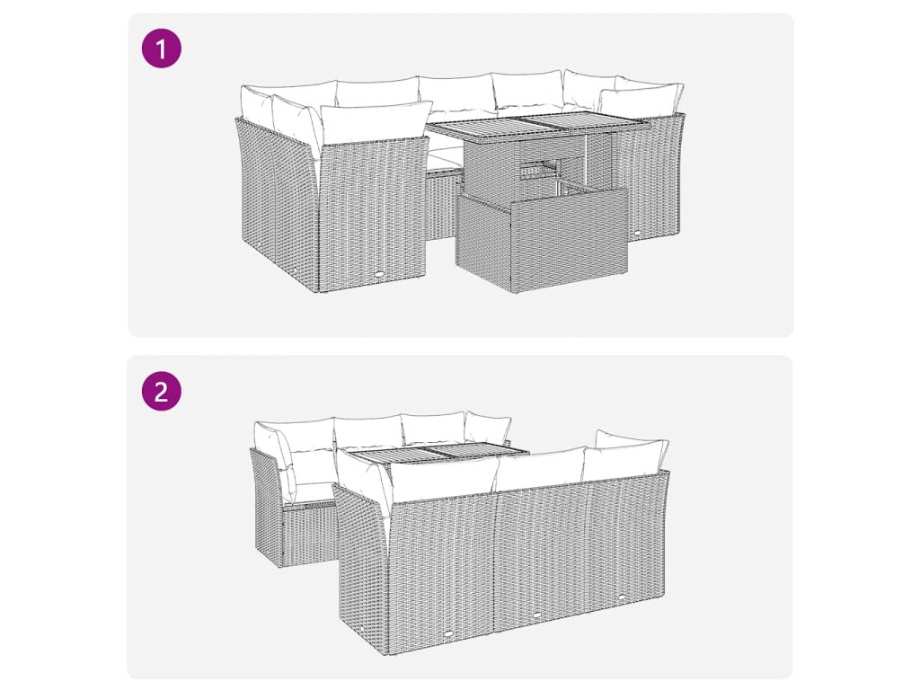 - Nastavitelná deska stolu: Stolní desku lze zvednout tak, aby stůl byl vyšší, takže jej můžete přeměnit z konferenčního stolku na jídelní. Skvěle se hodí pro návštěvy nebo pro stolování venku.
