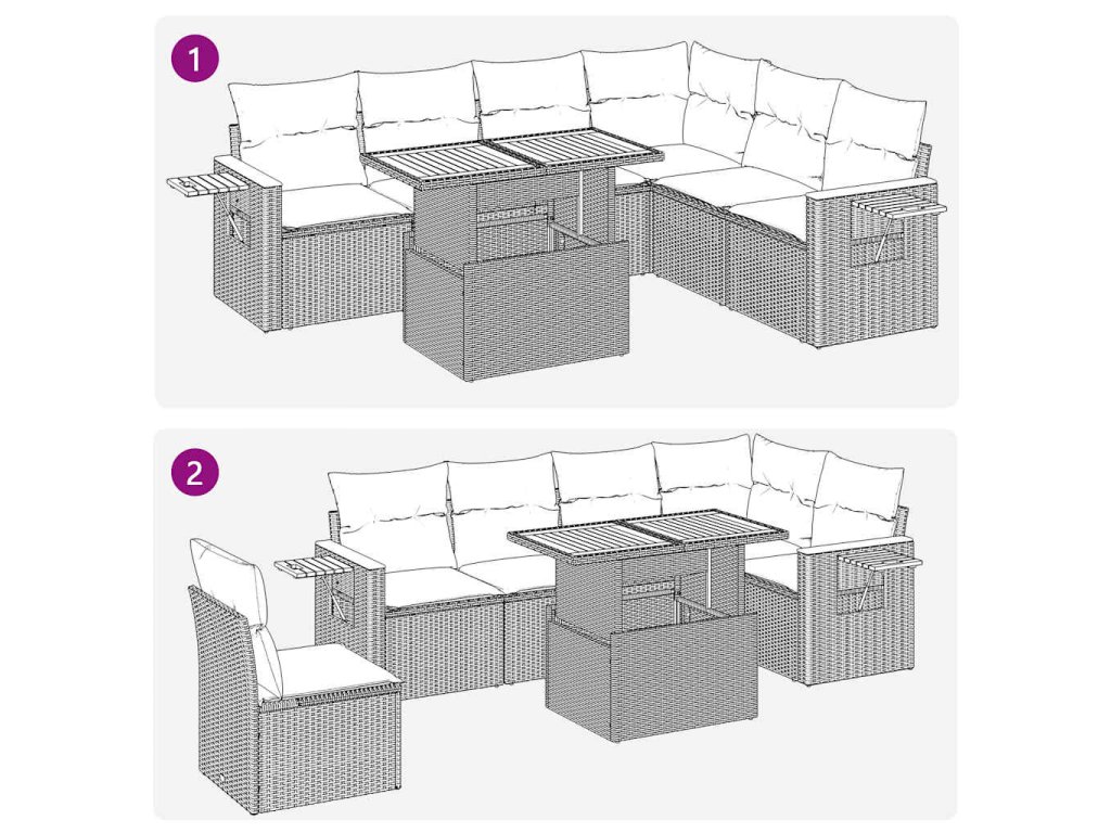 - Modulární design: Tato sada venkovního nábytku se vyznačuje modulární konstrukcí, je tedy zcela flexibilní a lze ji snadno přemisťovat, takže si můžete uspořádat venkovní nábytek dle vašich potřeb.
