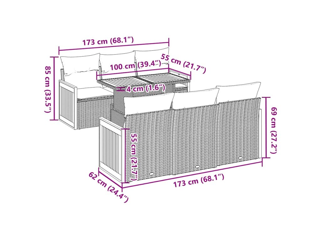 Tato zahradní sedací souprava je dokonalým doplňkem vaší zahrady, terasy nebo dvorku a poskytne vám pohodlné a příjemné místo, kde si můžete povídat s rodinou a přáteli nebo jen tak odpočívat a užívat si pobyt venku.
