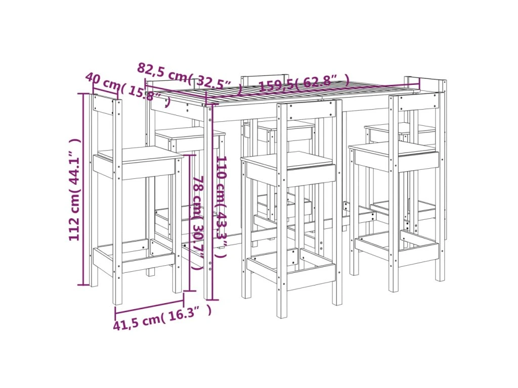 - Rozměry barového stolu: 159,5 x 82,5 x 110 cm (Š x H x V)