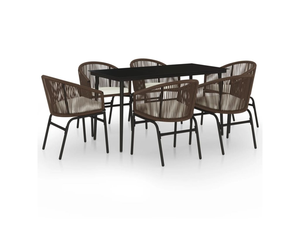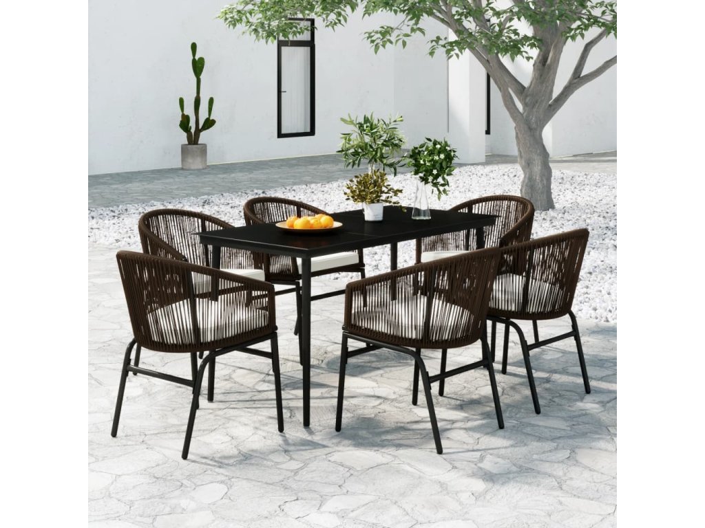 Zahradní jídelní set má práškově lakovaný ocelový rám, takže je robustní a stabilní a ideální pro venkovní použití. Hladká skleněná deska stolu se snadno čistí vlhkým hadříkem a skvěle vám poslouží k podávání jídla a pití nebo k vystavení různých dekorativních předmětů. Židle jsou vyrobené z PVC ratanu, jsou proto odolné a výborně vzdorují UV záření i špatnému počasí. Každá z nich je navíc opatřená odnímatelnou hustě polstrovanou poduškou, a zpříjemní vám tak váš odpočinek.
