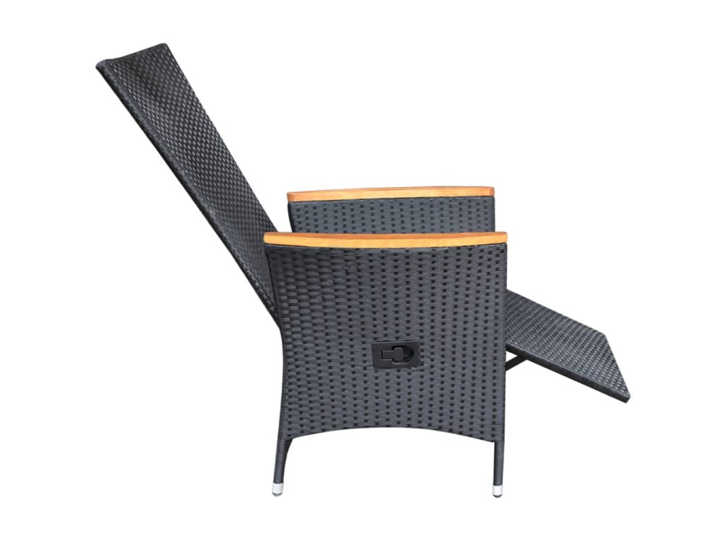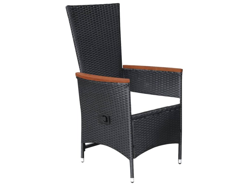 Jídelní stůl je zhotovený z masivního akáciového dřeva, takže je pevný a stabilní. Olejem napuštěný povrch vám umožní používat tento stůl i ve venkovních prostorech. Jídelní židle mají ocelový rám, který je opletený klimaticky odolným PE ratanem, jsou proto bytelné a snadno se udržují čisté. Područky jsou krásně zdůrazněné masivním akáciovým dřevem, které do vašeho domova vnese rustikální šarm. Stisknutím tlačítka na boku můžete sklopit opěradlo a zároveň i zvednout podnožku. Každá židle má hustě polstrovanou podušku, abyste si při odpočinku mohli dopřát mimořádný komfort.