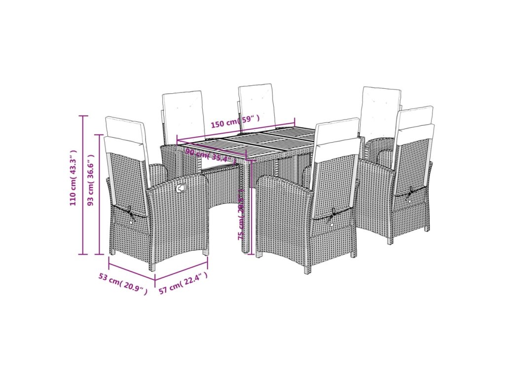 - Materiál: PE ratan, práškově lakovaná ocel, masivní akáciové dřevo s olejovou povrchovou úpravou