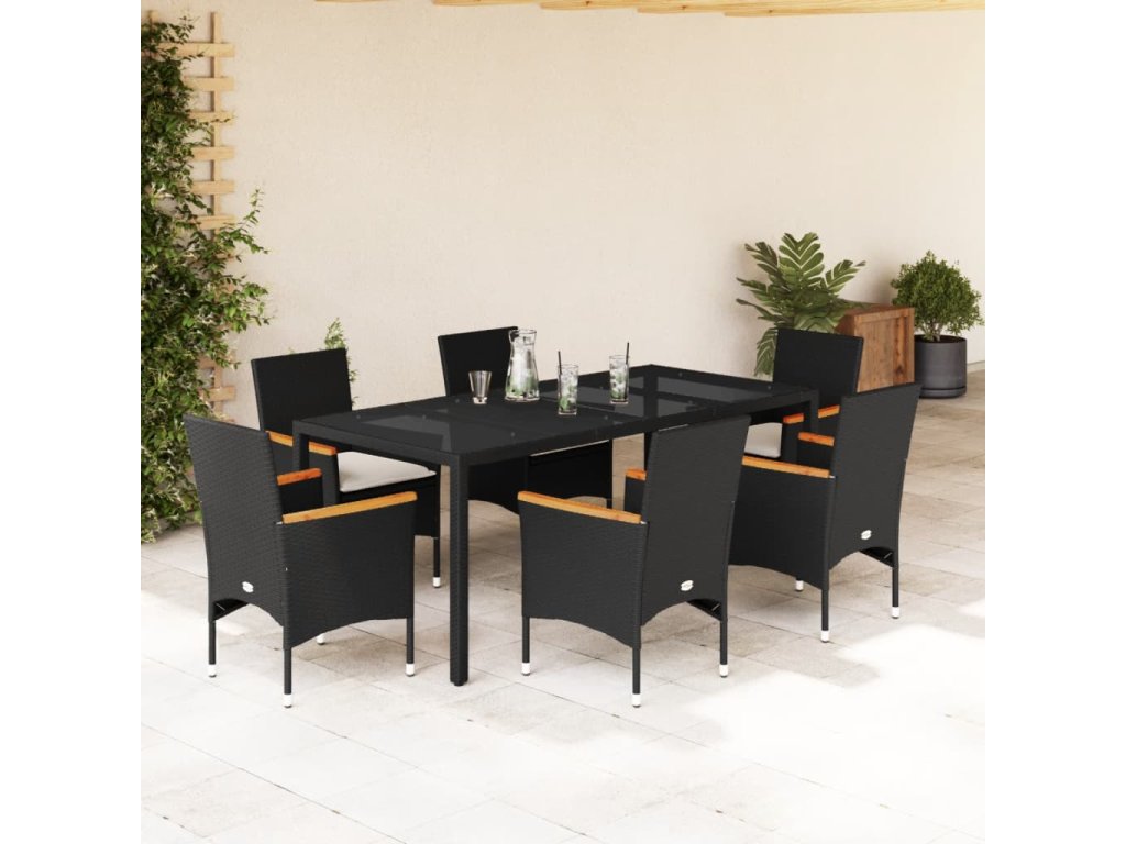 7dílný zahradní jídelní set s poduškami černý polyratan a sklo 3278649