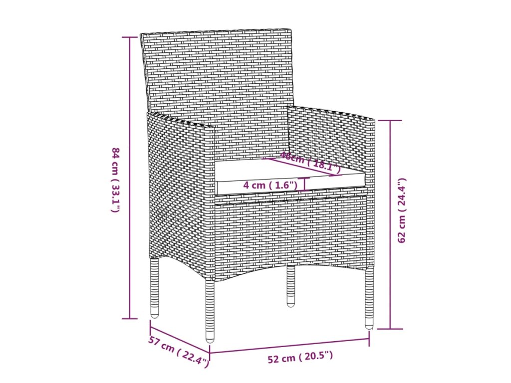 Stůl a židle mají rámy z práškově lakované oceli, jsou tedy dostatečně robustní a stabilní pro každodenní venkovní použití. Židle jsou zhotoveny z voděodolného PE ratanu, takže se snadno čistí a jsou vhodné pro každodenní použití. Hladká skleněná stolní deska se snadno čistí vlhkým hadříkem a navíc se skvěle hodí k servírování jídla a nápojů či k vystavování různých dekorací.