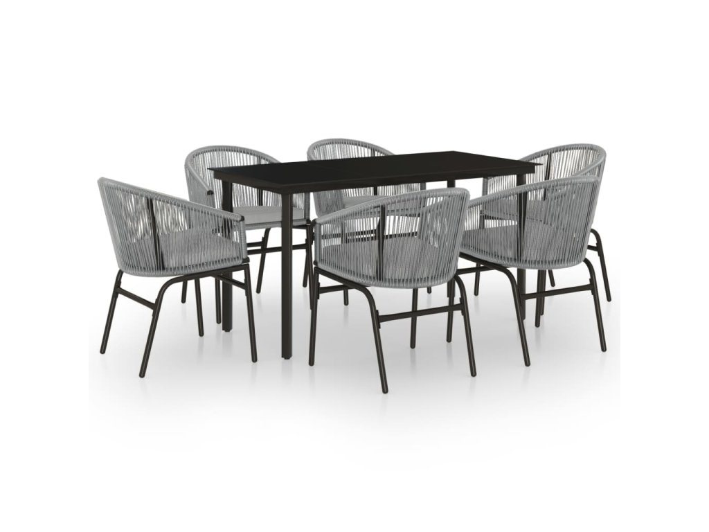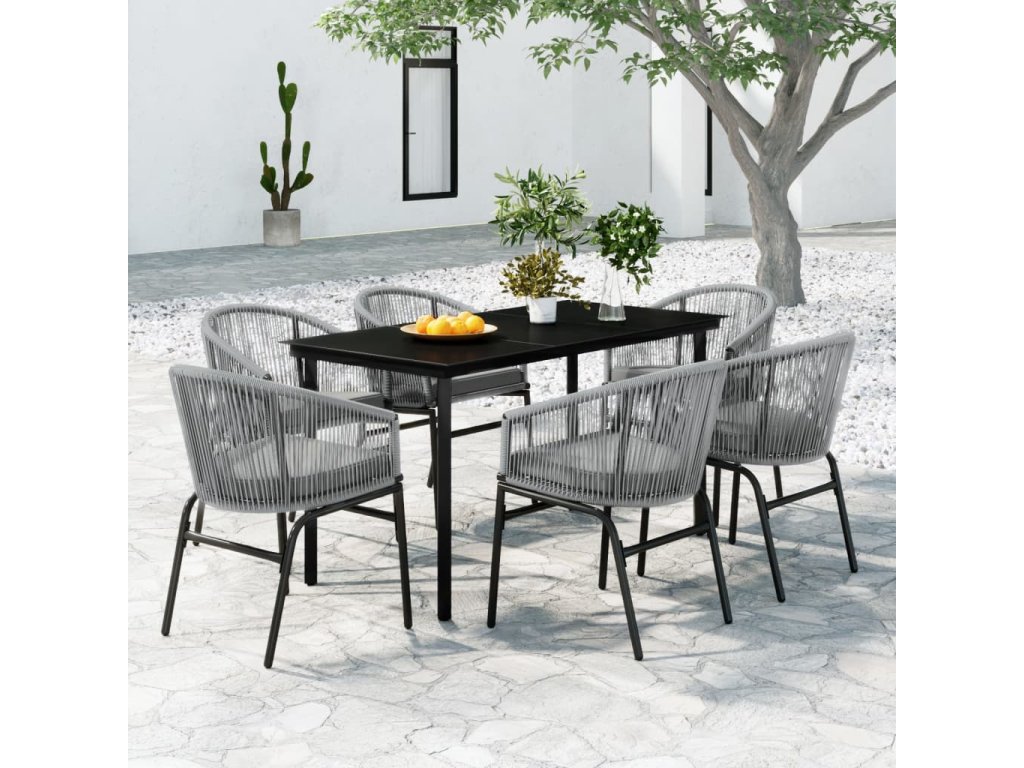 Zahradní jídelní set má práškově lakovaný ocelový rám, takže je robustní a stabilní a ideální pro venkovní použití. Hladká skleněná deska stolu se snadno čistí vlhkým hadříkem a skvěle vám poslouží k podávání jídla a pití nebo k vystavení různých dekorativních předmětů. Židle jsou vyrobené z PVC ratanu, jsou proto odolné a výborně vzdorují UV záření i špatnému počasí. Každá z nich je navíc opatřená odnímatelnou hustě polstrovanou poduškou, a zpříjemní vám tak váš odpočinek.