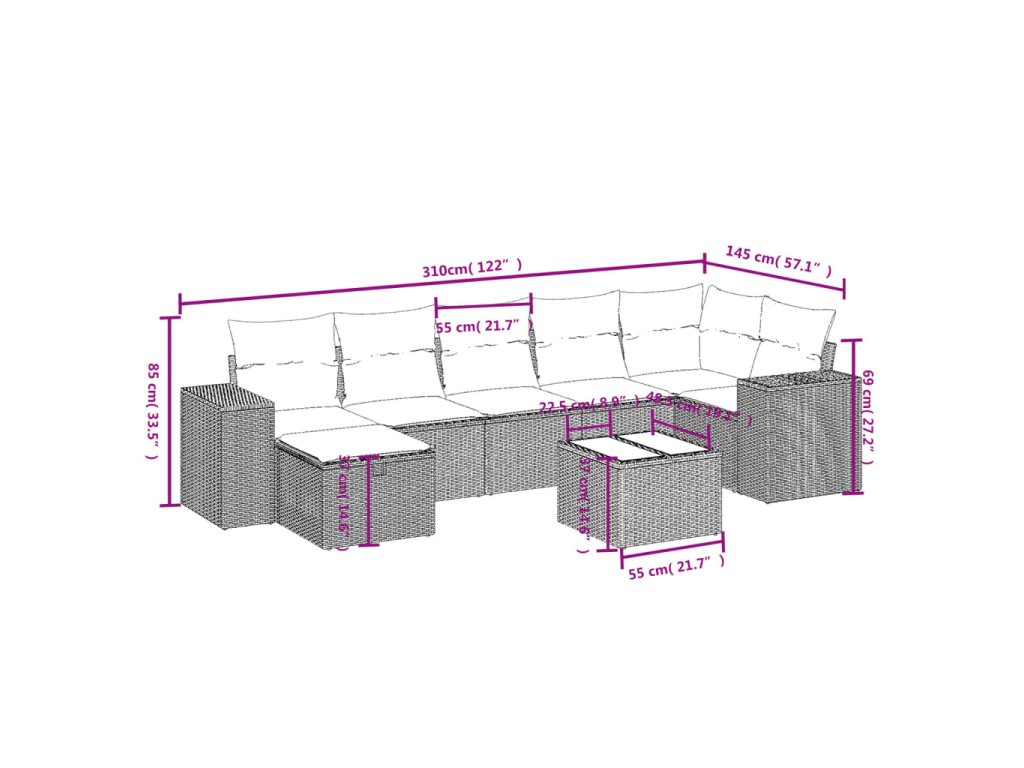 Tato zahradní sedací souprava je dokonalým doplňkem vaší zahrady, terasy nebo dvorku a poskytne vám pohodlné a příjemné místo, kde si můžete povídat s rodinou a přáteli nebo jen tak odpočívat a užívat si pobyt venku.