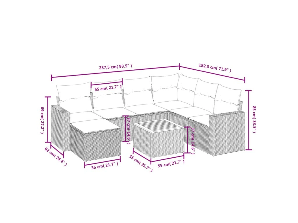 Tato zahradní sedací souprava je dokonalým doplňkem vaší zahrady, terasy nebo dvorku a poskytne vám pohodlné a příjemné místo, kde si můžete povídat s rodinou a přáteli nebo jen tak odpočívat a užívat si pobyt venku.